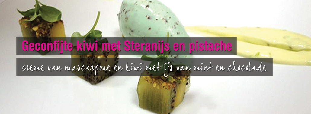 - druk de geconfijte blokjes kiwi in de pistache kruim en zet deze strak boven mekaar op het bord , in de zelfde lijn als de crème.