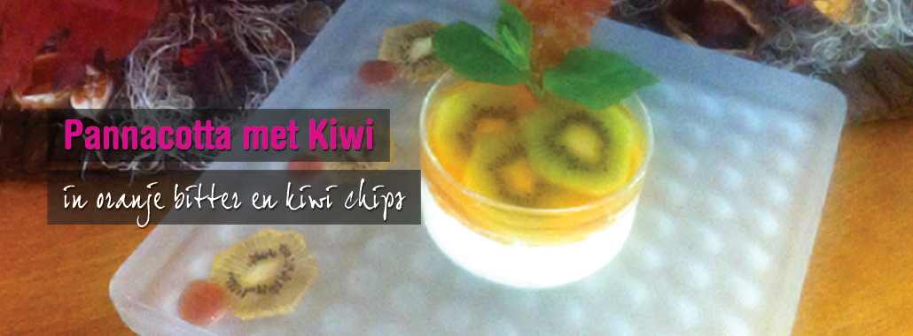 Snijdt mooie plakjes van de kiwi en garneer die op de afgekoelde pannacotta, giet de afgekoelde oranjebitter op de kiwi en laat geleren.