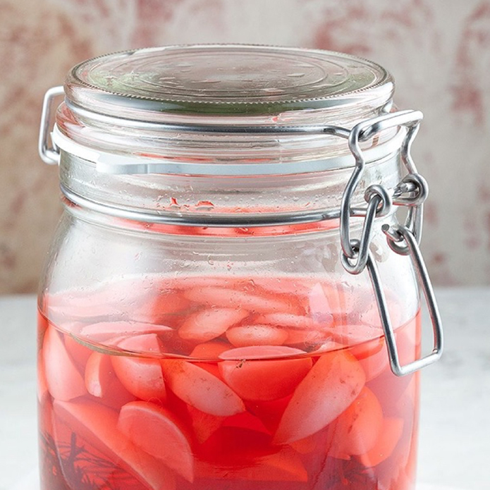 - Snijdt ondertussen de radijs in plakjes of in partjes en doe deze in een weckpot of een afdekbare bak.