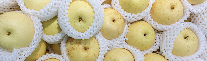 Deze Chinese peer lijkt qua vorm een beetje op een appel, maar is toch echt een peer. De bite is bijna krokant. De smaak is zoet en erg fris. Ze komen binnen in een netkous, om de kwaliteit te waarborgen.